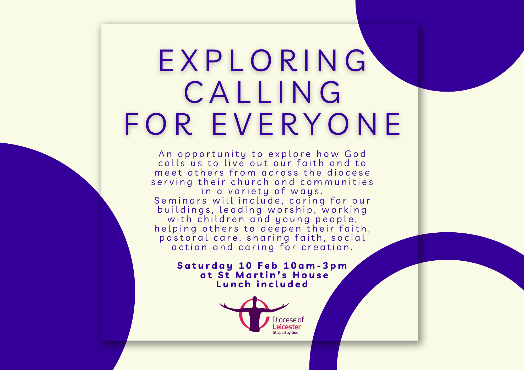 Exploring Calling For Everyone takes place on Saturday 10 February, 10am to 3pm at St Martins House Leicester. Click here for more information and to sign up via The Hub.