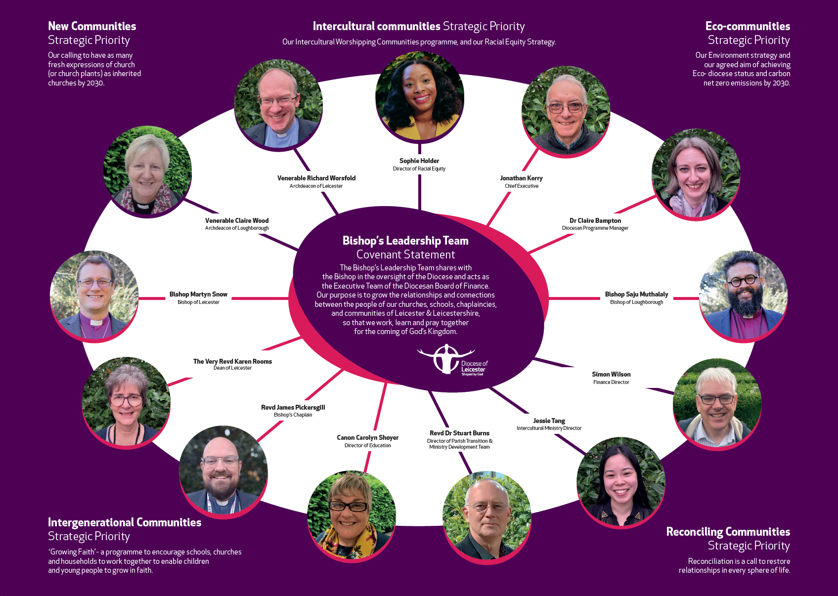 The Bishops are supported in their decision-making by colleagues from the Diocesan Board of Education, the Parish Transition and Ministry Team, the Archdeacons, Dean of Leicester, Intercultural Ministry Director and Chief Executive of the Diocesan Board of Finance.