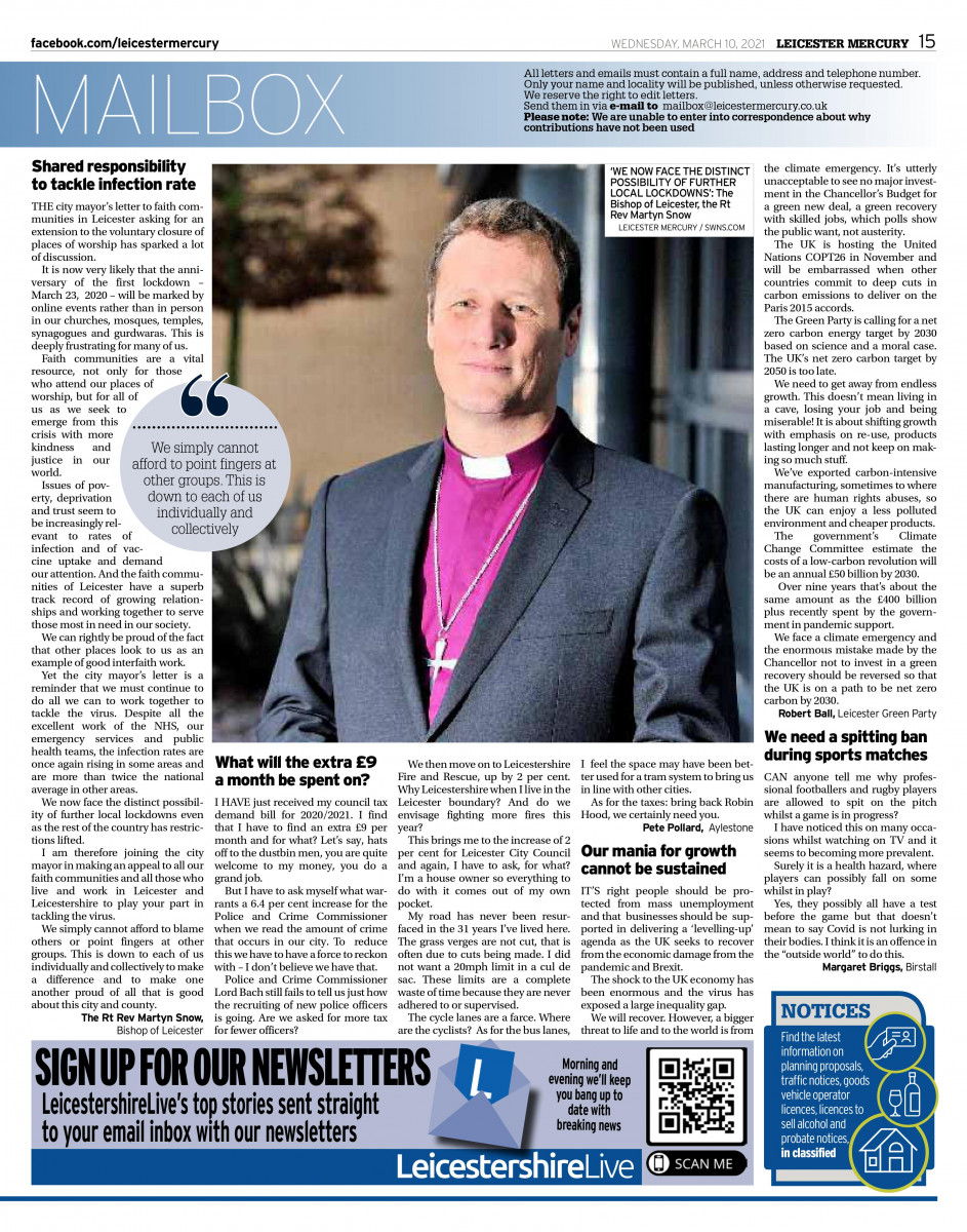 The Bishop of Leicester has published an opinion piece in the Leicester Mercury encouraging all of us to take individual and collective responsibility for tackling infection rates in the city and county despite the sadness of many places of worship remaining closed as we mark the anniversary of the first lockdown.