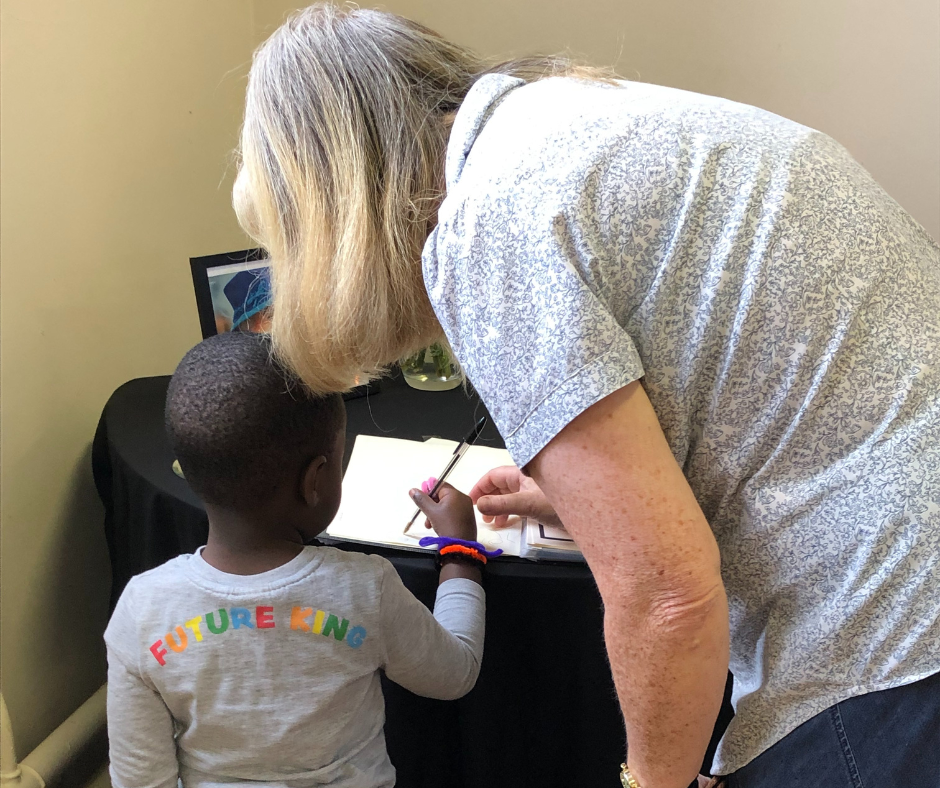 This moving photo shows a boy being helped by his Grandmother to write his name in the Book of Condolence at Christ Church, Thurnby Lodge, Leicestershire.