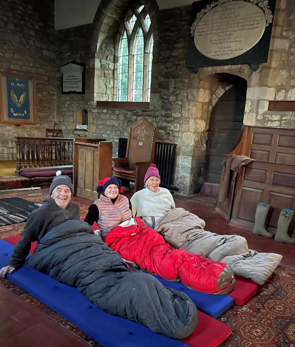 Revd Biddy Saunders, her husband Phil and farmer’s wife Jane Mount, set up camp in the chancel and wrapped themselves in sleeping bags and woolly hats for the overnight adventure in aid of FareShare Midlands.