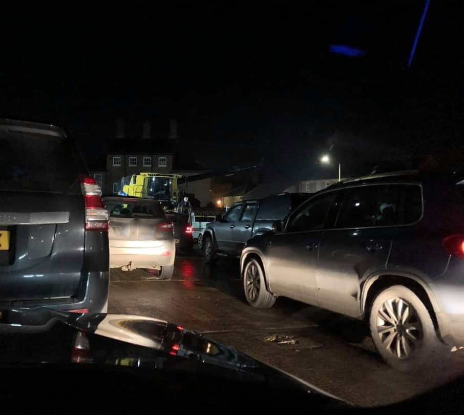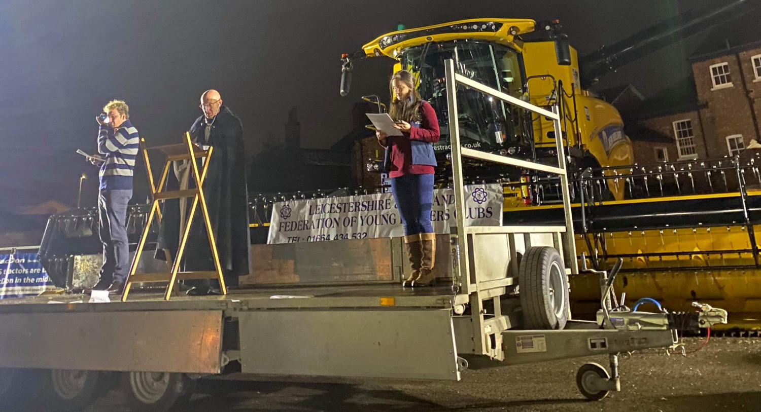 Cars and tractors gathered on a slightly raked car park, looking down to a make-shift stage (a farm trailer) with a combine harvester as the backdrop and two tractors either side providing lighting from their headlights, where Revd Peter led the service.