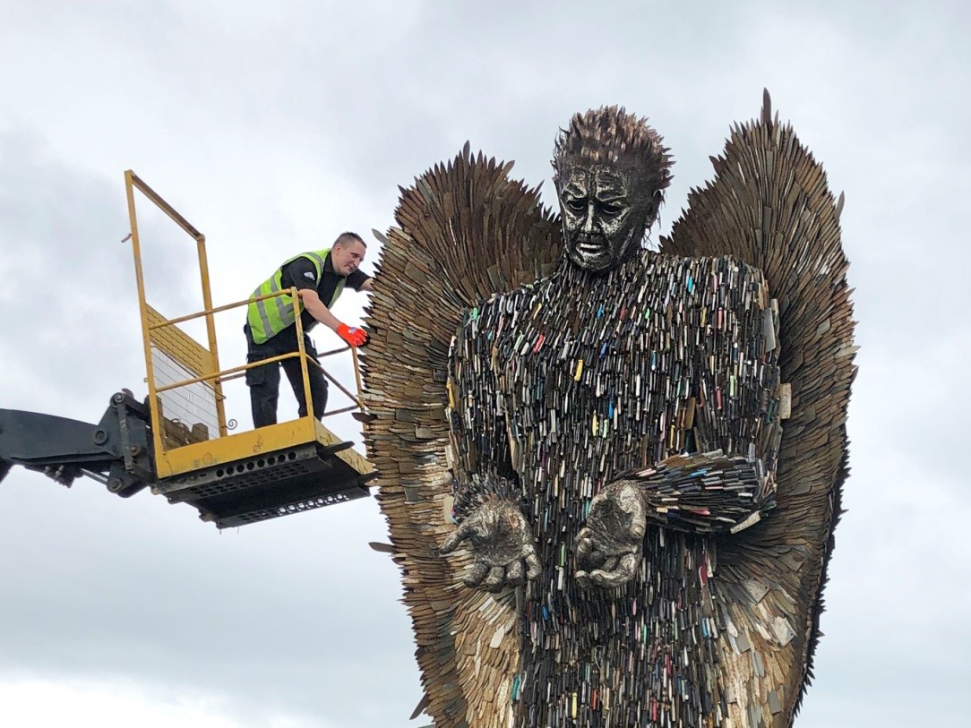 The Knife Angel project has now been building for over six years with the monument taking two years to make and stands 20 feet tall (up to 27 feet with a high plinth). It is made from over 100,000 knives which have been taken out of circulation and collected by all 43 UK Police Constabularies as supported by the Home Office. It is a response to the problem of Knife Crime and Violence and Aggression in our society and has been specifically formed to create social change against all forms of violent behaviour. It is made by Clive Knowles and his team at the British Ironwork Centre in Shropshire with sculptor Alfie Bradley (More info here).