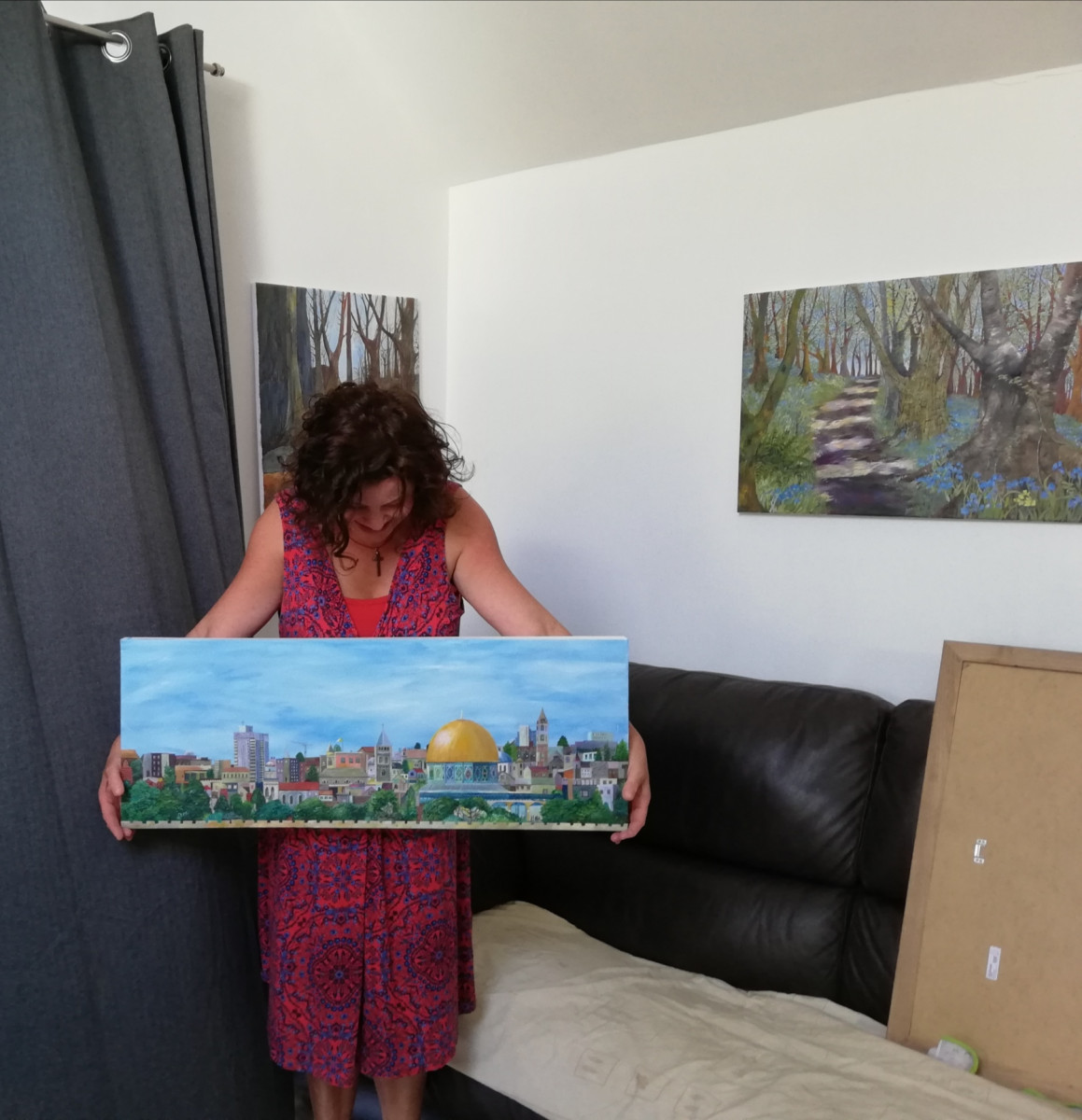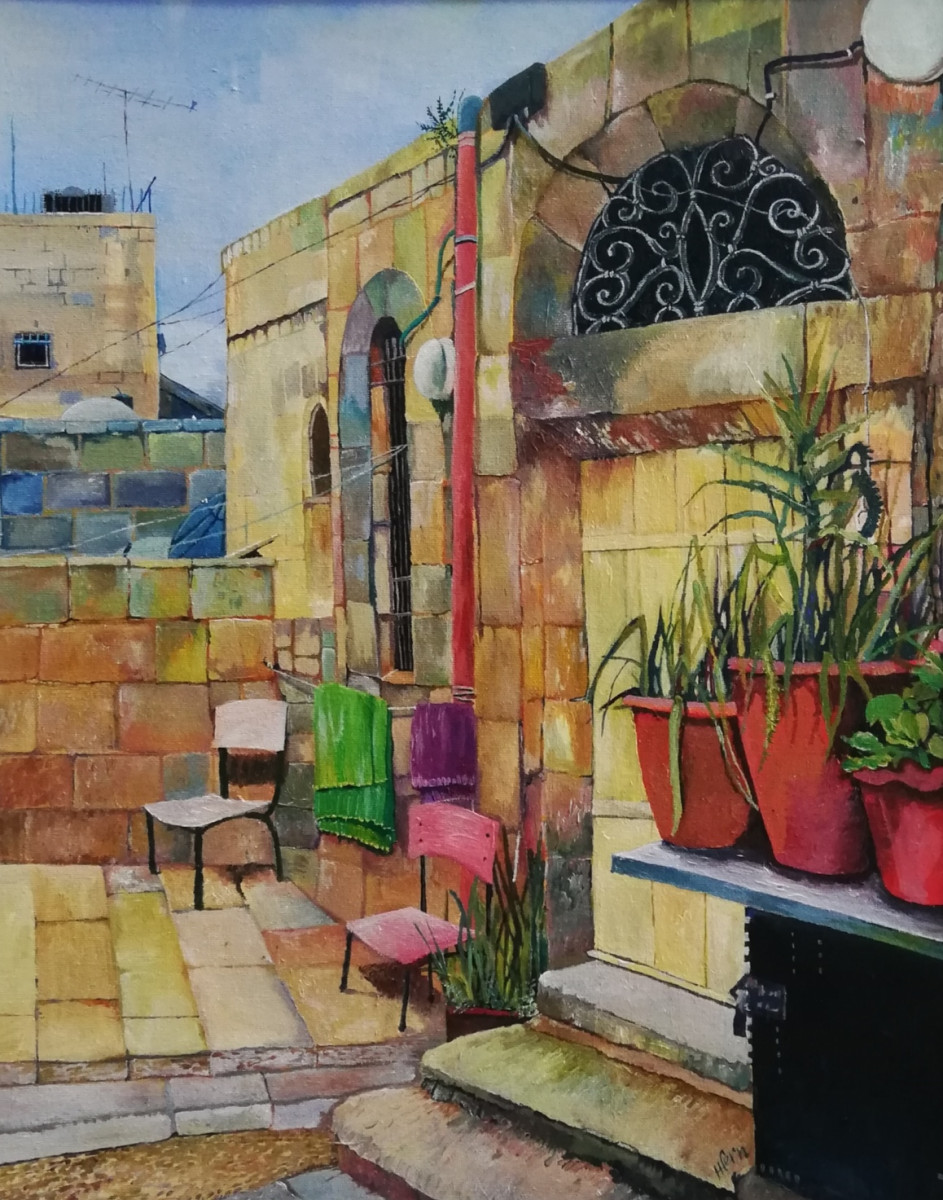 I've painted a domestic courtyard in Jerusalem, the mountains where the Dead Sea scrolls were found, a woman spinning wool using traditional methods in Nazareth village and a panoramic of Jerusalem with the Dome of the Rock as a focus.